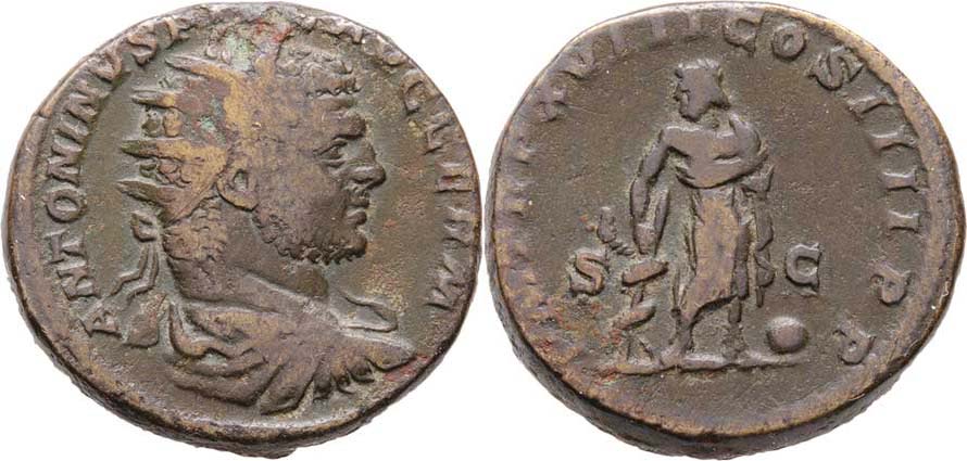 AE Dupondius, Rv:"P.M.TR.P.XVIII.COS.IIII.P.P.S.C.", stoj. Aesculapus, S.neuvádí, RIC.549a - mincovna Řím - ražba z roku 215, mírně exc., pěkná patina R!