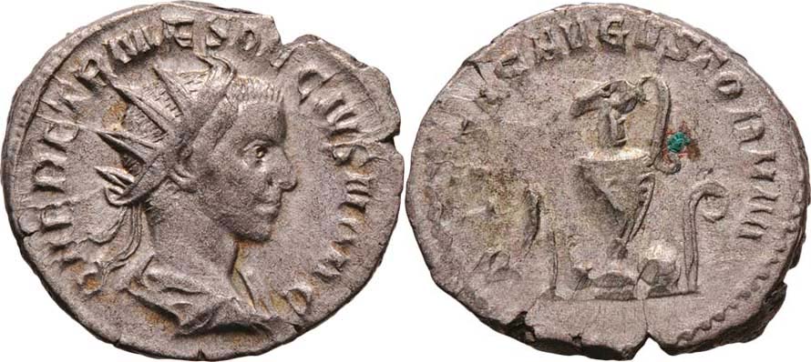 AR Antoninianus, Rv:"PIETAS.AVGVSTORVM.", bohoslužeb. náčiní, S.2641, RIC.143 - mincovna Řím - ražba z let 250 - 251, nepravidelný okraj střížku, skvr., pat. R!