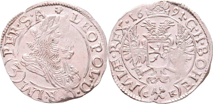3 Krejcar 1691 CK, K.Hora-Krahe, Nech.309, MKČ.1455, 1.532g, nepravidelný okraj střížku, nedor., téměř