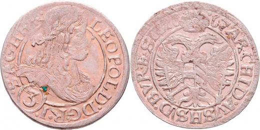 3 Krejcar 1667 SHS, Vratislav-Hammerschmidt, dělení opisů: "...R.I.(3).S.A.../...AV.(SHS).D.BVR.ET.SIL.", MKČ.1619, Nech.737, 1.729g, nedor., skvrny