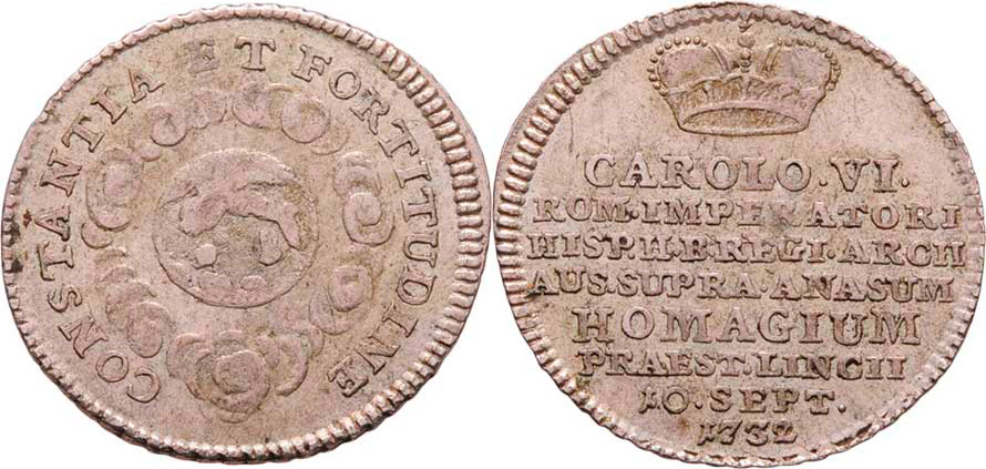 Menší jeton na holdov. v Linci 10.IX.1732 - zeměkoule v oblacích, opis/ koruna a 8-řádkový nápis, Nesign., Ag 20mm, 1.887g, M.1608, Nov.BB.3b, nep.exc., patina