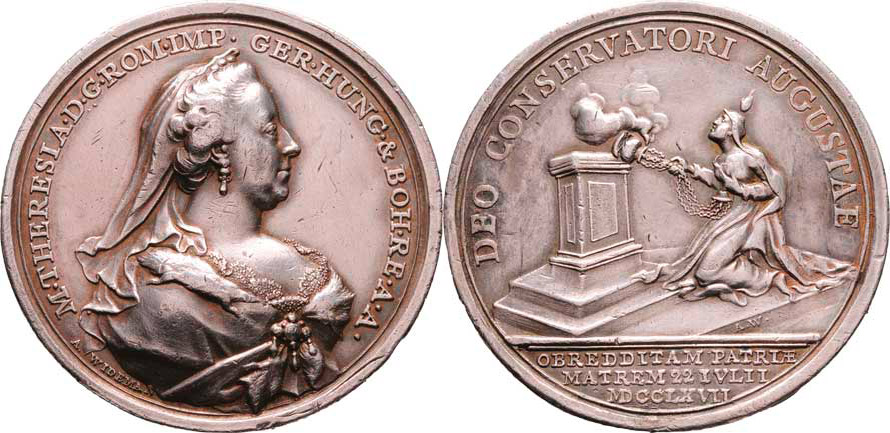 Widemann - AR medaile na uzdravení od neštovic 1767 - poprsí zprava, opis / císařovna klečící před oltářem, opis a nápis, Sign., 47mm, 34.696g, M.1976, hr., rys.