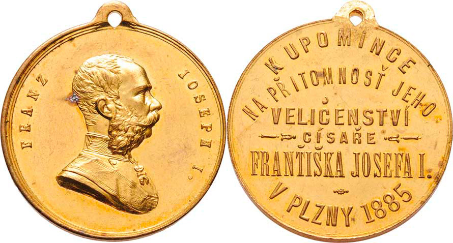 Nesign. - Na přítomnosť jeho veličenství v Plzny 1885 - portrét zprava, něm.opis / 6-řádkový "český" nápis, zlacený bronz 30 mm s původ. raženým ouškem, skvrnky