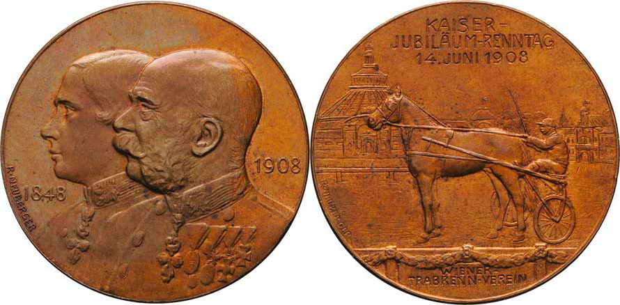 Neuberger - jubilejní závody klusáků v Prátru 1908 - mladé a staré poprsí Fr.Josefa zleva, vročení / kůň s vozíkem, budovy a nápisy, Sign., bronz 30 mm, patina