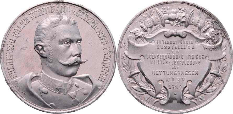 Pittner - Mezin.výstava zdravotnictví ve Vídni 1894 - poprsí zprava, opis / nápis ve štítu, rohy hojnosti, Sign. v aversu, hliník 42 mm, koroze R!