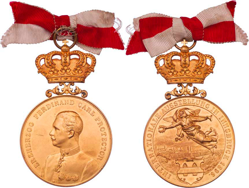 Mezinárodní výstava v Innsbrucku 1896 - poprsí zleva, opis / Fama letící nad městem, znak a opis, Sign. Christlbauer, zlac.bronz 51 mm převýš.korunou, etue