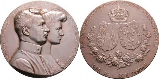 Marschall - svatební medaile 21.X.1911 - dvojportrét, opis / dva znaky pod korunou, věnec z růží, opis, Sign., patin. postř. bronz 80 mm, 218.472g, vl.rysky