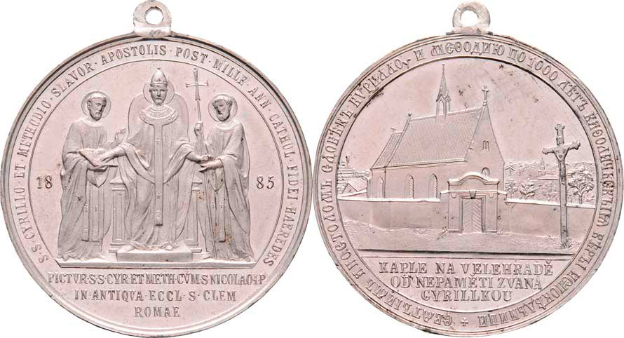 Papež mezi Cyrilem a Metodějem, opis a nápis 1885 / kaple Cyrilka, opis a nápis, cín 38 mm s původním ouškem, nep.hr.