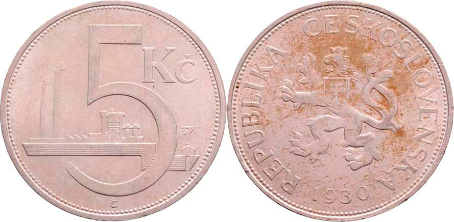 5 Koruna 1930 - dvě různé varianty vlnovek na hraně (Ag500), 7.997g, 6.959g, nep.hr., nep.rysky, skvrny, patina, téměř 2ks