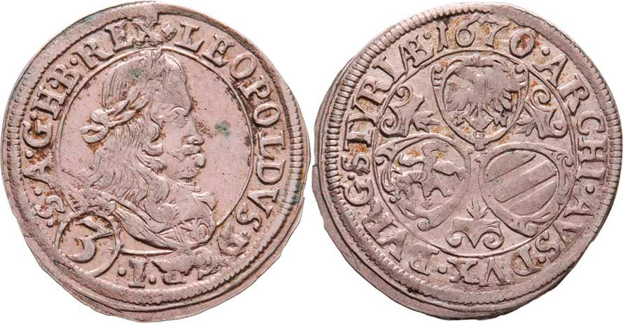 3 Krejcar 1670 IGW, Štýrský Hradec-Weiss, Nech.2214, M-A.169, hvězdička na konci opisu aversu, 1.499g, nep.nedor., nep.vada razidla, nep.skvrnky, patina