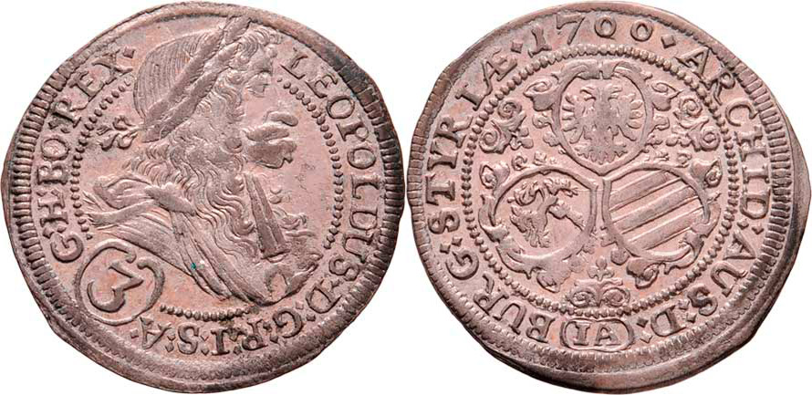 3 Krejcar 1700 IA, Štýrský Hradec-Aigmann, Nech.2237, M-A.199, 1.581g, nep.exc., nep.nedor., patina