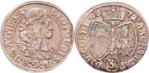 3 Krejcar 1672, Hall, Nech.2434, M-A.171, 1.485g, vada materiálu na hraně, skvrny, patina R!