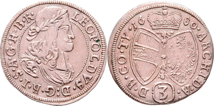 3 Krejcar 1680, Hall, Nech.2442, M-A.179, 1.609g, nep.exc., nep.nedor., pěkná patina