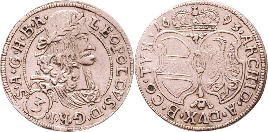 3 Krejcar 1693, Hall, Nech.2457, M-A.192, 1.481g, téměř