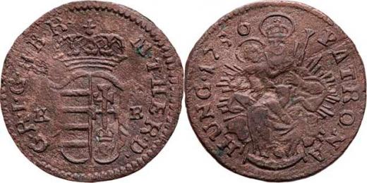 Bil.denár 1756 KB, N.87c, Husz.1749, 0.394g, nep.zvlněný, nep.nedor., pěkná patina R!