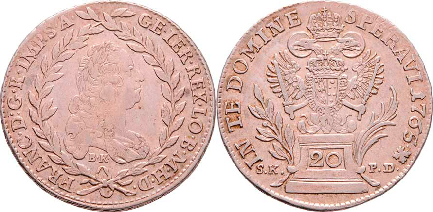 20 Krejcar 1765 BK/SK-PD - posmrtný (1776), N.47, Husz.1799, 6.607g, mírně just., nep.hr., nep.rysky, pěkná patina, téměř