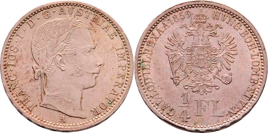 1/4 Zlatník 1859 A, 5.324g, dr.hrany ražbou, nep.rysky, pěkná patina, téměř