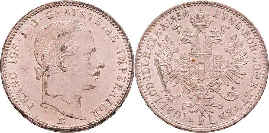 1/4 Zlatník 1858 E - menší ozn. nominálu, 5.330g, mírně just., nep.hr., nep.rysky, skvrnky, patina RR!
