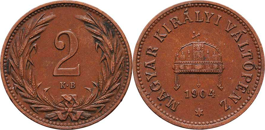 2 Haléř 1904 KB, 3.308g, nep.hr., nep.rysky, pěkná patina, téměř R!
