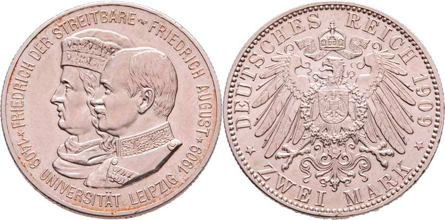 2 Marka 1909 - Universita Lipsko, KM.1268 (Ag800), 11.070g