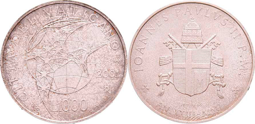 1000 Lira 2001 R - XXIII.rok pontifikátu, Y.338 (Ag835, 14.6g), skvrnky, patina, téměř