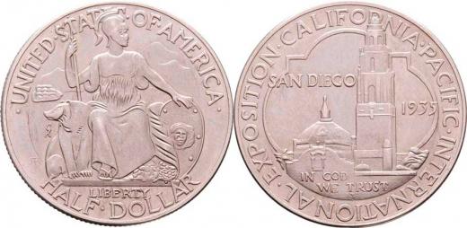 1/2 Dolar 1935 - San Diego Exposition, KM.171 (Ag900, pouze 70.132 ks), 12.505g, nep.hr., vl.rysky, skvrnky, patina R!