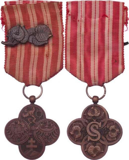Československý válečný kříž 1914-1918, VM.5-II-B, II.vydání (1920-1938), tmavý bronz 37.5mm, kulovité ouško, na stuze lipový lístek za kolektivní pochvalu