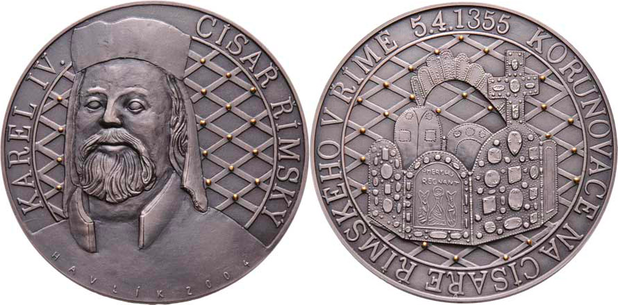 Karel IV. - 650 let císařské korunovace v Římě 2005 - poprsí mírně zleva, opis / císařská koruna, opis, Sign., patinované Ag999, 50mm, 49.935g, etue, certif.