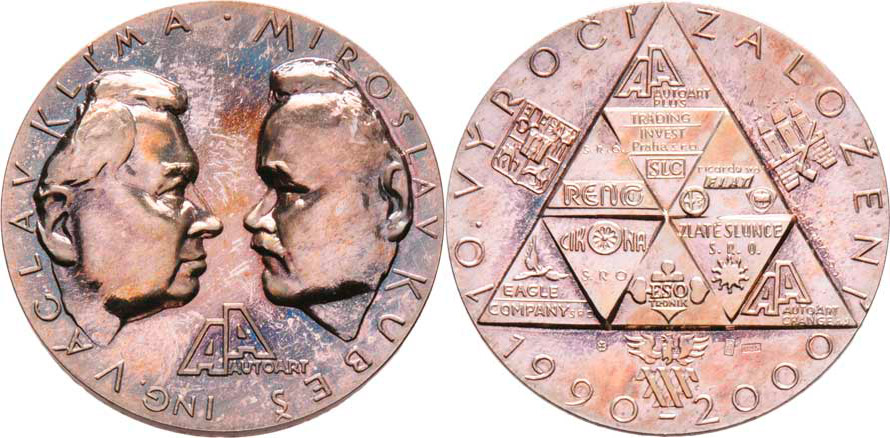 Ing.V.Klíma a M.Kubeš - 10 let společnosti Autoart 2000 - dva portréty, emblém, opis/ emblémy, znaky, opis, Sign., Punc., Ag925, 40mm, 35.209g, etue, text