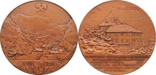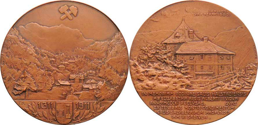 Hallstatt - 600 let povýšení na horní město 1911 - město v horské krajině, kladívka, vročení / zámek, nápisy, Sign., patinovaný bronz 50 mm