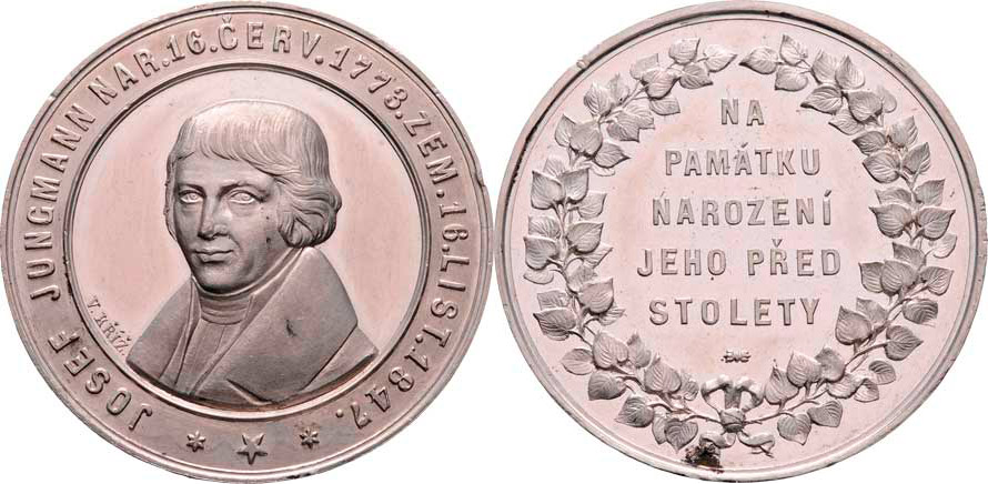 Josef Jungmann - 100.výročí narození b.l. (1873) - poprsí mírně zleva, opis / 5-řádkový nápis v lipovém věnci, Sign., cín 41 mm, dr.hr., nep.rysky, patina