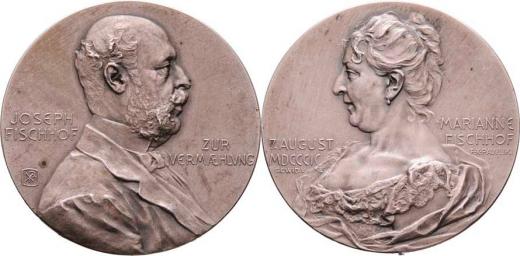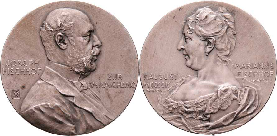 Josef a Marianne von Fischhof 1899 - portrét zprava, nápis / portrét zleva, nápis, Sign.FXP, Sign.BSW (Brüder Schneider-Wien), patin. Ag900, 33mm, 21.055g