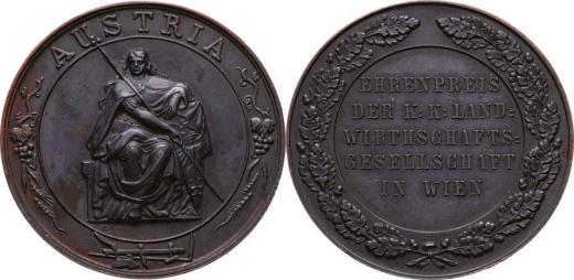 Hospodářský spolek ve Vídni - Čestná cena b.l. - sedící Austria, pluh, vinná réva, nápis / 5-řádkový nápis v dubovém věnci, Sign., měď 38 mm, patina, tém.