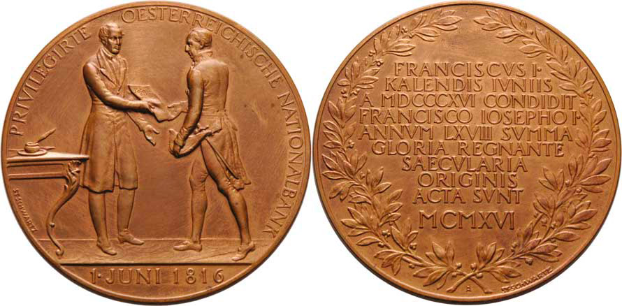 Vídeň - 100 let založení Rakouské národní banky 1916 - císař František předává guvernérovi banky zakládací listinu, opis / nápis ve věnci, Sign., bronz 65 mm