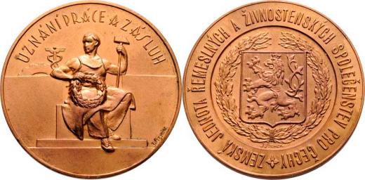 Zem.jednota řemeslných a živnosten.společenstev b.l. - sedící kovář čelně, opis / český znak ve věnci, opis, Sign., patinovaný pozlacený bronz 46 mm, hr.