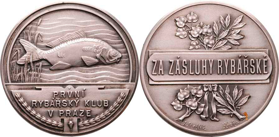 První rybářský klub v Praze b.l. - kapr zprava, nápis / lipová a vavřínová ratolest, nápis, Sign., Punc., patinované Ag800, 44mm, 38.353g