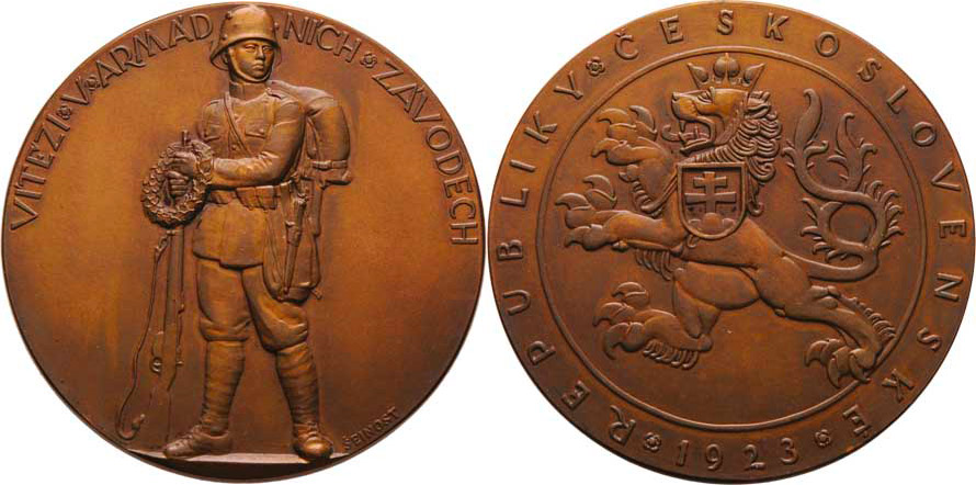 Vítězi v armádních závodech - velká medaile 1923 - stojící voják s puškou a věncem, opis / malý státní znak, opis, Sign., patin.bronz 55 mm, pouze 365ks