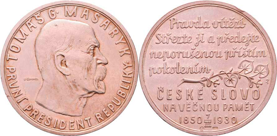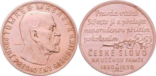 T.G.Masaryk - České slovo na věčnou paměť 1930 - hlava zprava, opis / lipová snítka, nápis, Sign., Punc., Ag 987, 35mm, 15.008g, Fl.31, hrana, vl.rysky
