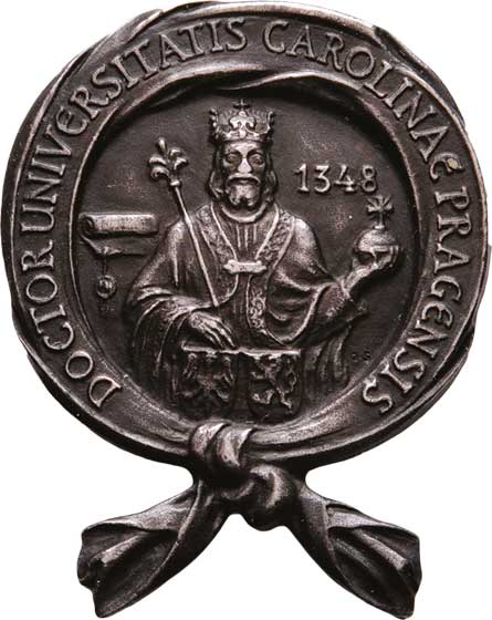 Odznak pro absolventy Karlovy university b.l. (1948) - Karel IV. s korunovačními insigniemi čelně, opis na stuze, Sign., Punc., patin. Ag987, 26x34mm, 11.450g
