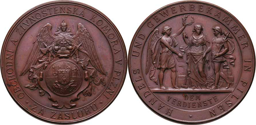 Obchodní a živnost.komora v Plzni - Za zásluhy b.l. - městský znak, český opis / tři alegorické postavy, německý opis, Nesign., bronz 44mm, krásná patina
