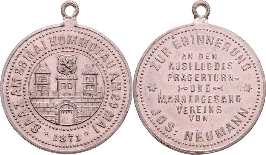 J.Neumann, numismatik - upomínka na výlet 28.5.1871 - znak Žatce, německý opis / německý 9-řádkový nápis, Nesign., cín 32 mm s raženým ouškem, Don.5147