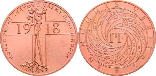 PF 2018 - 100.výročí konce 1.svetové války - kříž, malá lípa, puška, písmo / v paprscích jména vydav., "PF", opis, Sign., měď 30mm, 12.096g, pouze 13ks RRR!