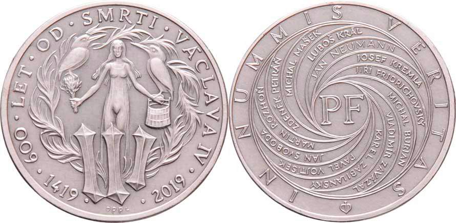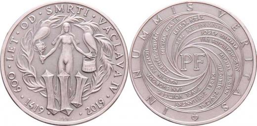PF 2019 - 600 let úmrtí Václava IV. - "W", lazebnice, ledňáčci a opis / "PF", v paprscích jména vydavatelů, opis, Sign., patin. Ag925, 30mm, 14.835g, původ.etue
