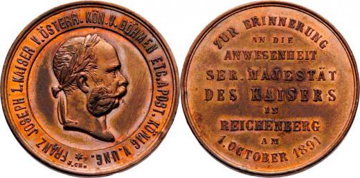 Návštěva Fr.Josefa I. v Liberci 1.X.1891 - poprsí císaře zprava, něm. opis / 9-řádk. něm. nápis, Sign. Christlbauer, zl.bronz 28 mm, ŠFP.91a, dr.hr., škr.