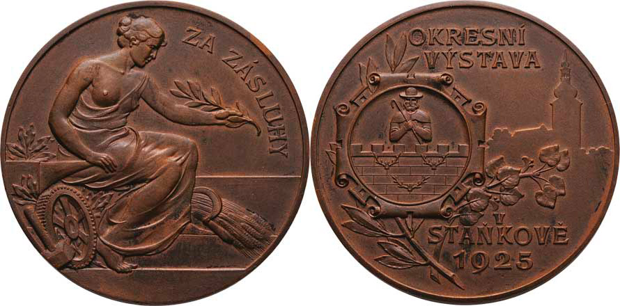 Okresní výstava 1925 - Zásluze - výstavní alegorie, opis / znak města v kartuši, kostel, 5-řádkový nápis, Nesign. (Stehlík ?), patinovaný bronz 52 mm R!