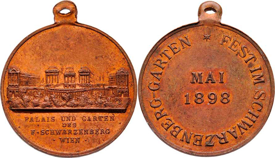 Slavnost ve Schwarzenberských zahradách - Mai 1898 - palác a zahrady, 3-řádkový nápis / nápis a opis, Nesign., bronz 23 mm s původním raženým ouškem, pat.