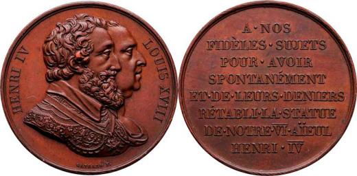 Ludvík XVIII. - odhalení pomníku Jindřicha IV. 1817 - dvojportrét zprava, opis / 8-řádkový nápis, Sign. Gayrard, měď 32mm, 18.596g, pěkná patina, téměř