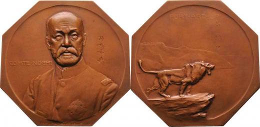 Hrabě Noghi - Port Arthur 1912 - poprsí čelně, nápisy latinkou a čínskými znaky / řvoucí lev na skále, nápisy, Sign.H.Taglang-Vienne, patin. bronz 70x70 mm