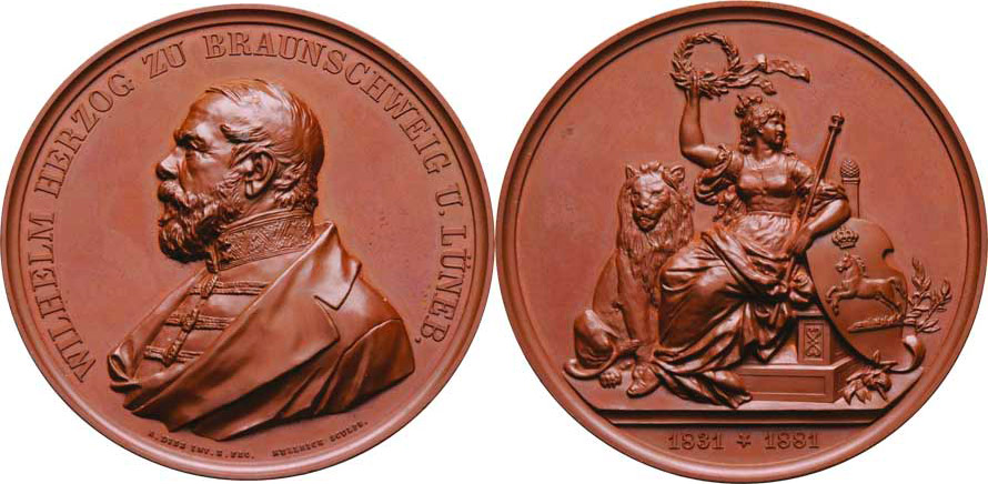 Wilhelm - 50 let vlády 1881 - poprsí zleva, opis / sedící Germanie se lvem a znakem , vročení, Sign. Diez-Kullrich, měď 60mm, 108.416g, krásná pat., etue