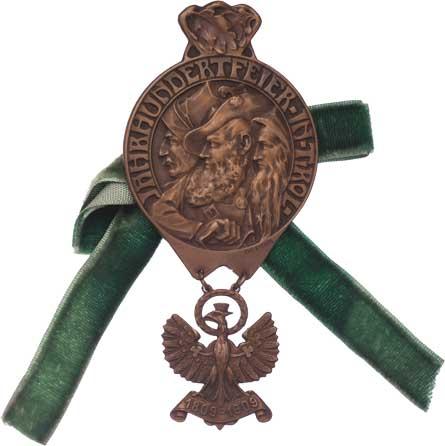 Biendl / Christlbauer - 100 let obrany Tyrol 1909 - tři tváře, opis, honosný bronzový odznak 43x87 mm se sponou a zelenou sametovou stužkou R!